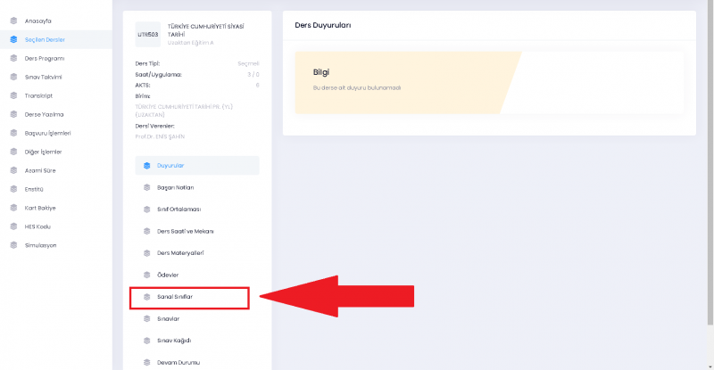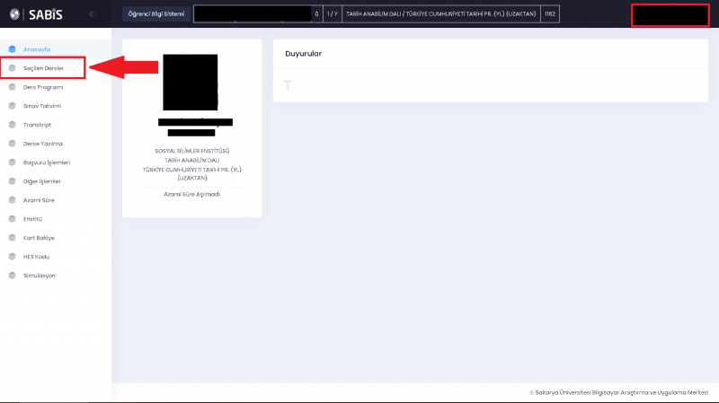 Uzaktan Eğitim Tezsiz Yüksek Lisans programına kayıtlı öğrenciler SABİS / Öğrenci Bilgi Sİstemi / Seçilen Dersler adımlarından derslere katılabilir. İlgili görseller ektedir.