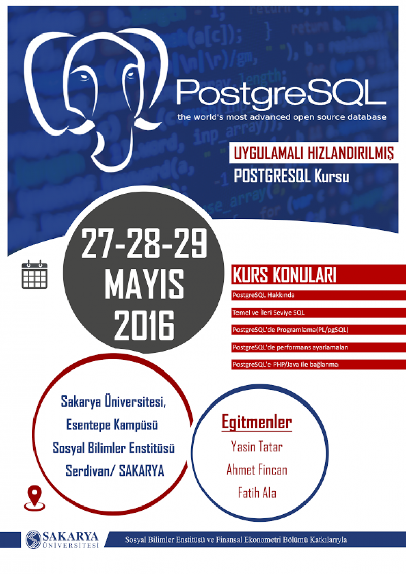 Sosyal Bilimler Enstitüsü ve Finansal Ekonometri Bölümünün Koordinatörlüğünde PostgreSQL eğitimi düzenlenecektir.